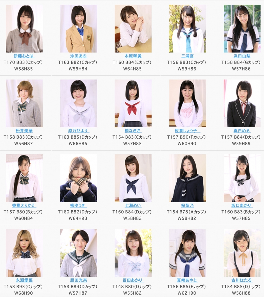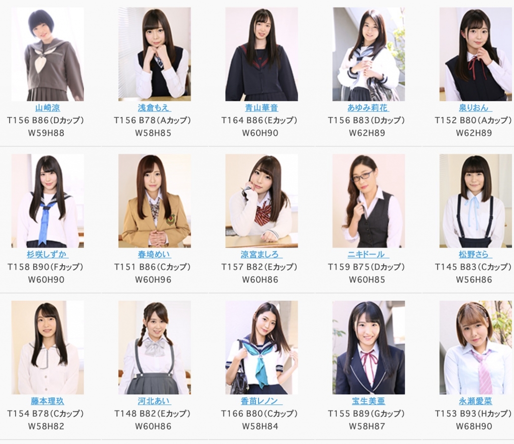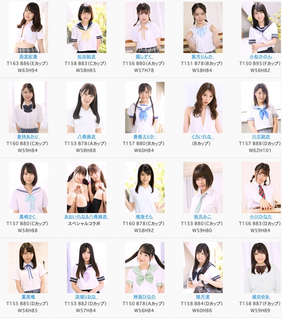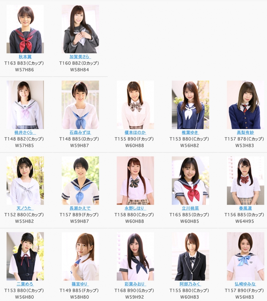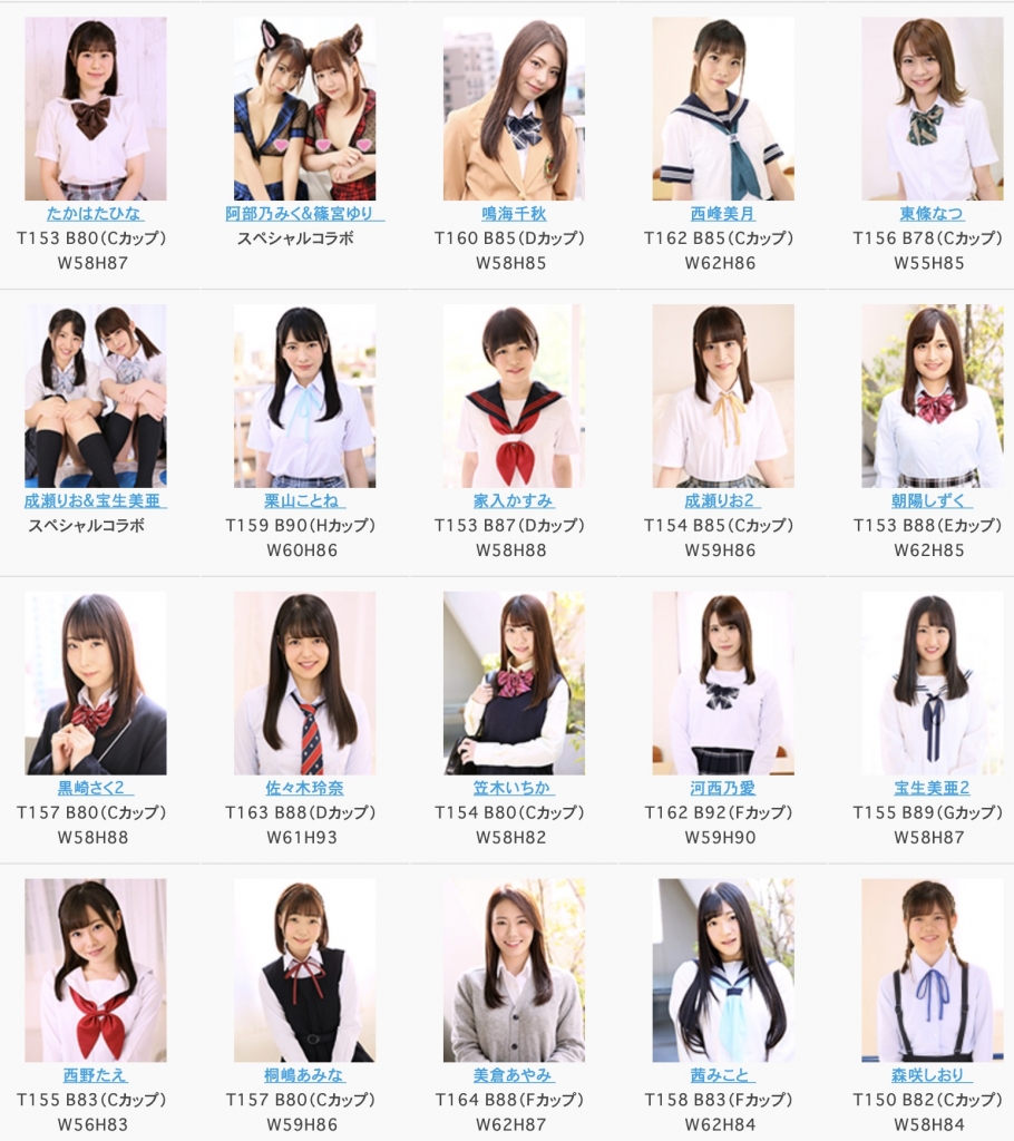 加賀美さら 東條なつ 天ノうた 阿部乃みく 高梨有紗 彩葉みおり 笠木いちか 倉持あかり 篠宮ゆり 浜田由梨といった、JKスタイルの似合うロリ系・かわいい系のAV女優・グラビアアイドルが多数登録されています。